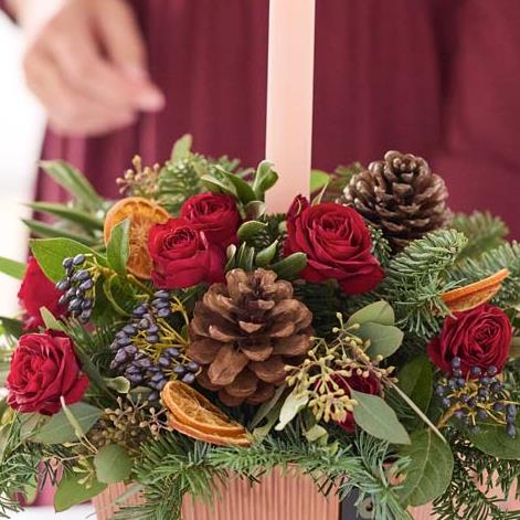 Send them flowers fit for the Christmas table. This beautiful arrangement centres around a festive candle. It'll feature blooms in rich red and green shades, with peach and cream highlights and pops of burgundy and cerise.