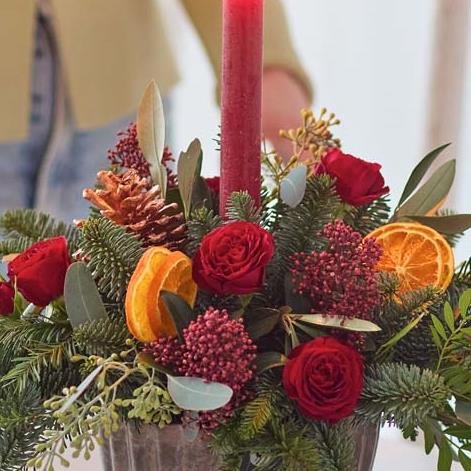 A gorgeous selected of fresh festive flowers, arranged with a red candle, in a dark copper coloured ceramic bowl.