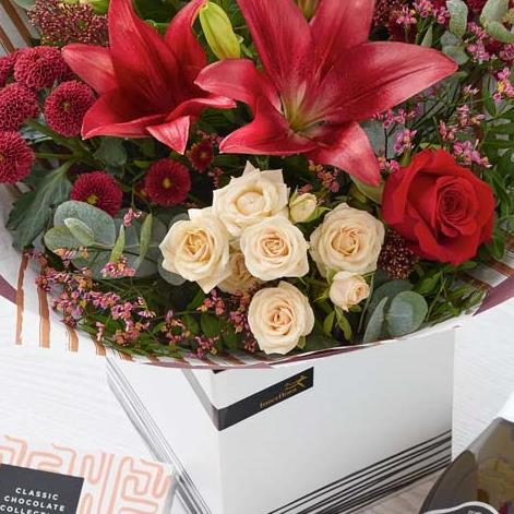 A gorgeous bouquet crafted by their local florist, using the finest blooms in rich red and green shades, with peach and cream highlights and pops of burgundy and cerise. And in case that wasn't enough to make them merry, this one comes with a bottle of fizz and chocolates too.