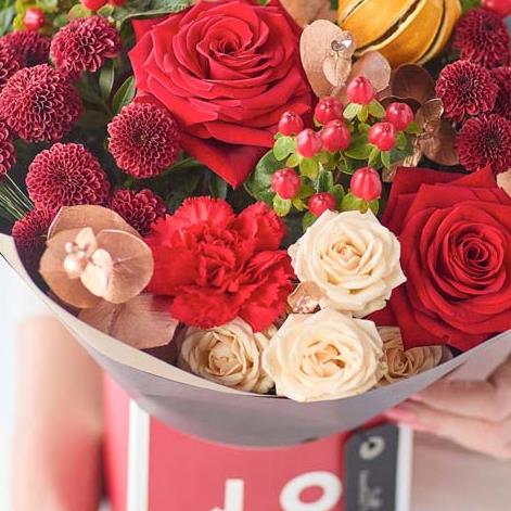 A lovely little gift box of fresh blooms in classic Christmassy colours.