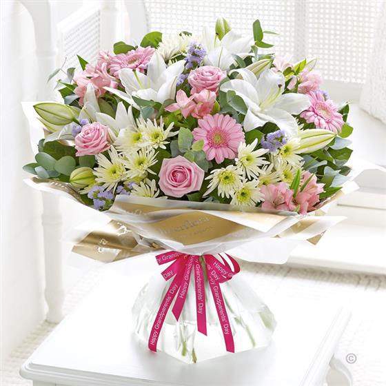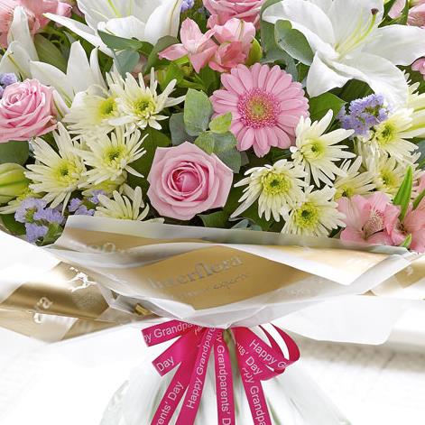 Featuring pink alstroemeria, white Oriental lily, pink large headed rose, white spray chrysanthemums, lilac statice and pink germini with eucalyptus and salal, wrapped and trimmed with ‘Happy Grandparent's Day’ ribbon and presented in Interflora Gift Packaging.