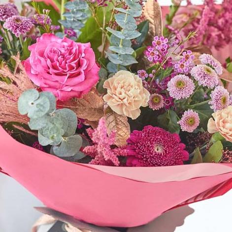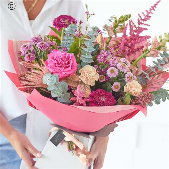 A beautiful bouquet handcrafted in cerise and purple tones, with soft pink, peach or lilac shades. It might also feature dried flowers or foliage painted in copper or rose gold.