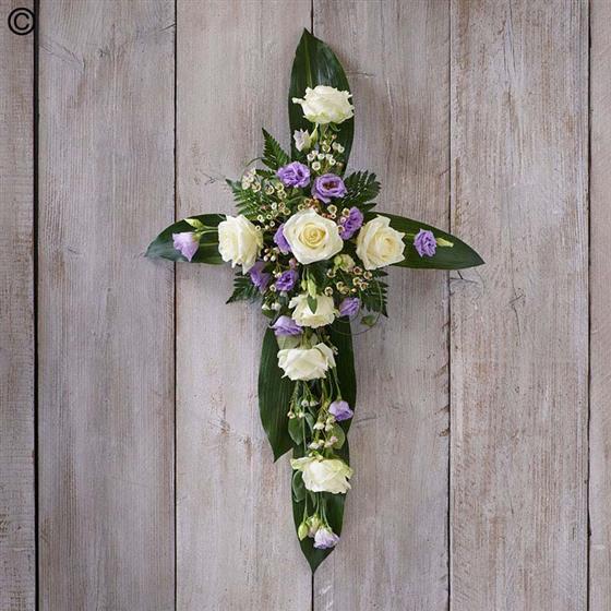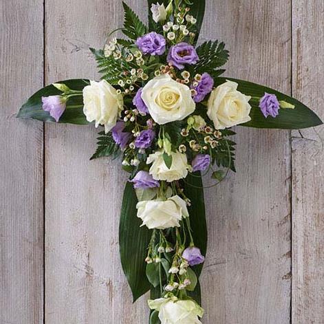 A beautiful lilac and white cross featuring roses and eucalyptus.
