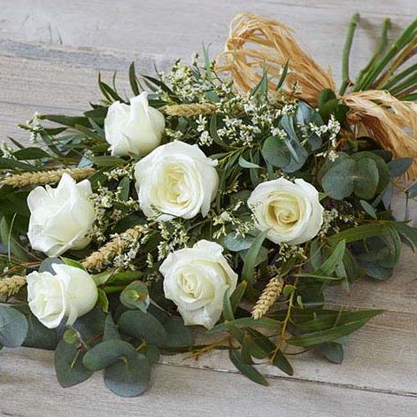 Gorgeous roses and eucalyptus beautifully combined with natural elements and a raffia bow.