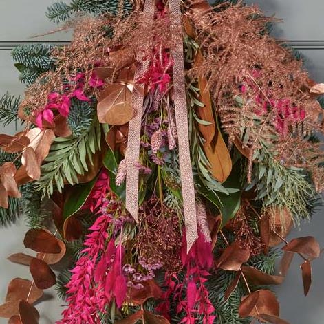 Known as a 'swag' (for hanging on a door or wall) this beautiful decoration will bring fresh festive style to the street. It'll feature fresh Christmas foliage. It might also feature dried flowers or foliage painted in copper or rose gold.